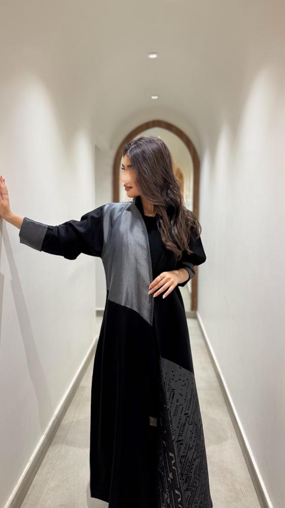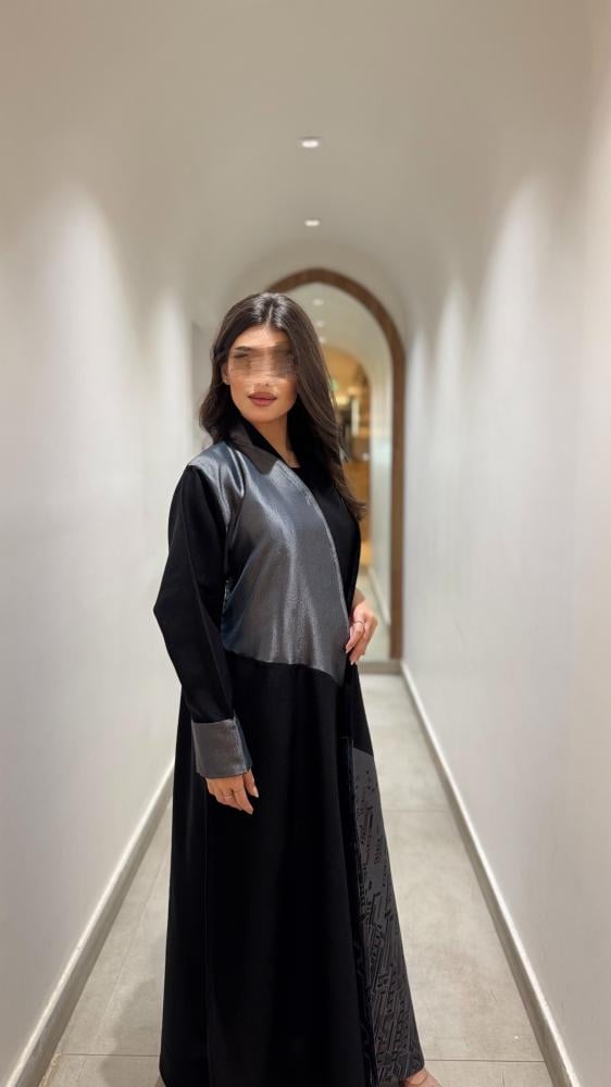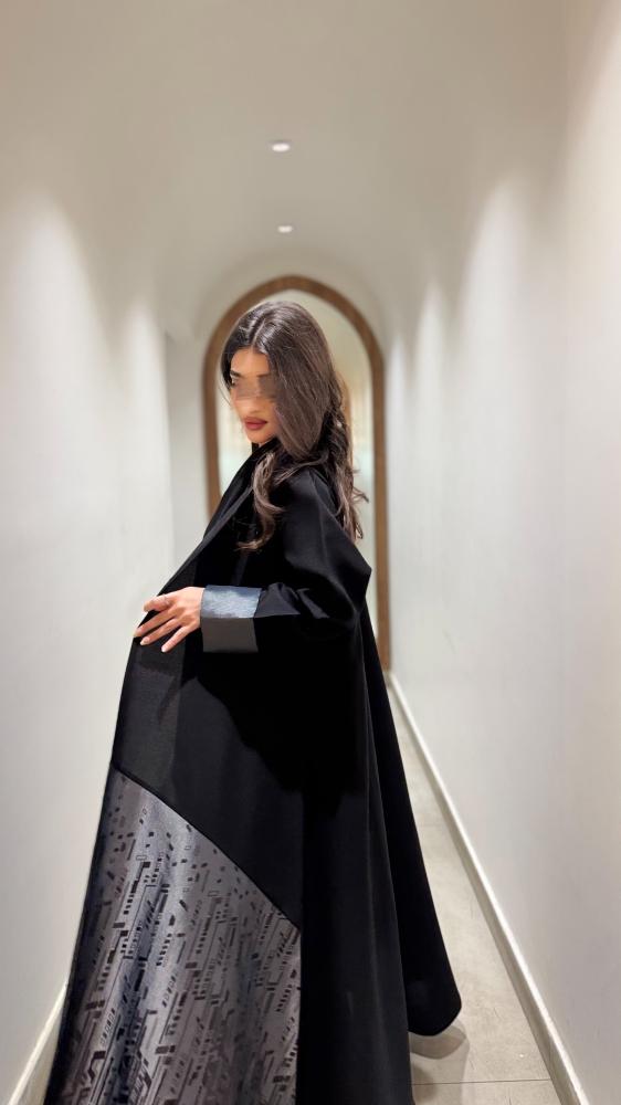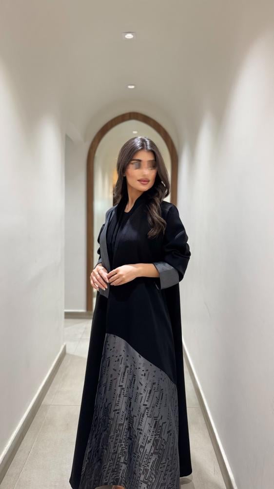 عبايه اورا قماش العبايه / كتان قماش اجناب العبايه/ جاكار مطبوع رصاصي قصه العبايه / نص كلوش الطرحه اسود مع تحديد رصاصي مده التفصيل / 5 ايام عمل