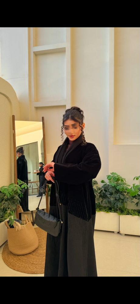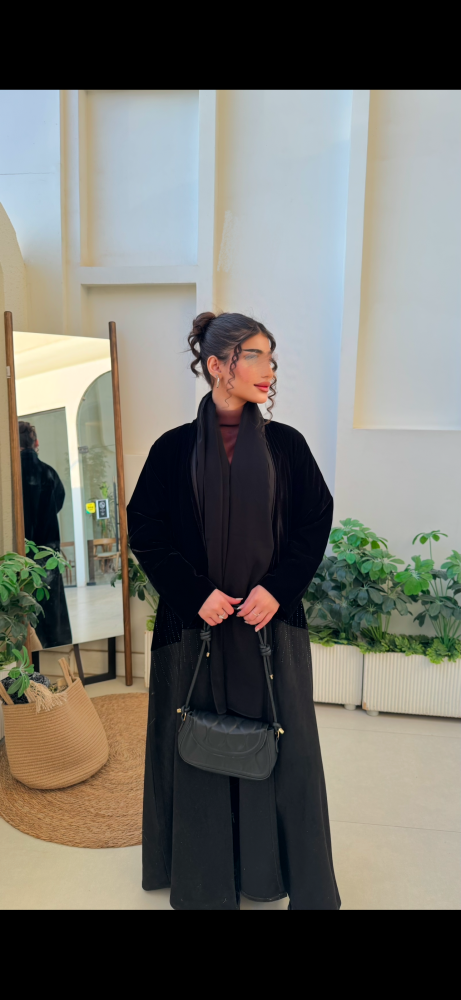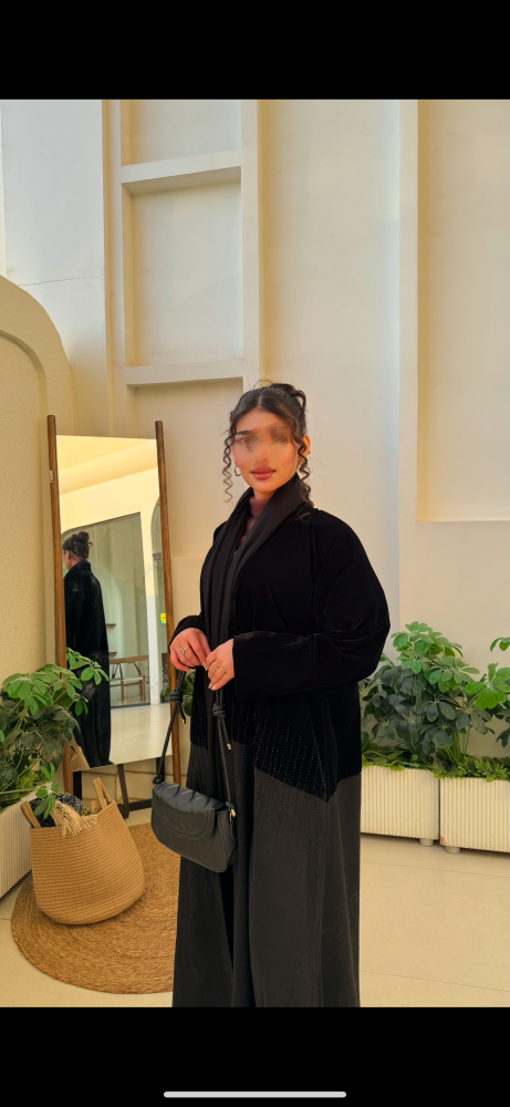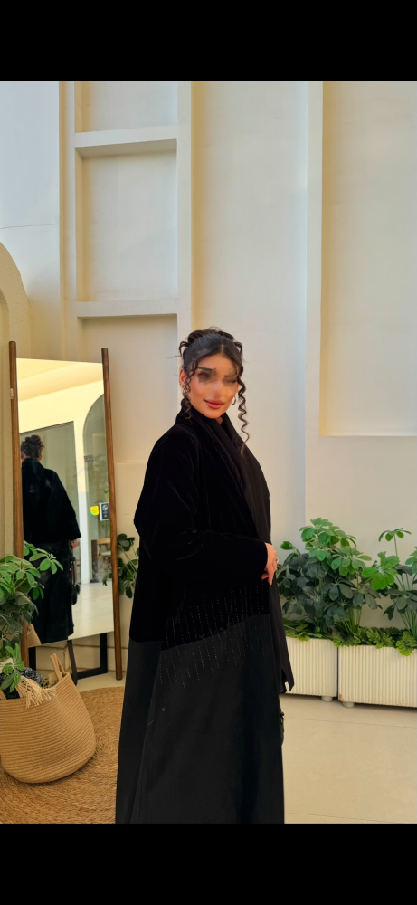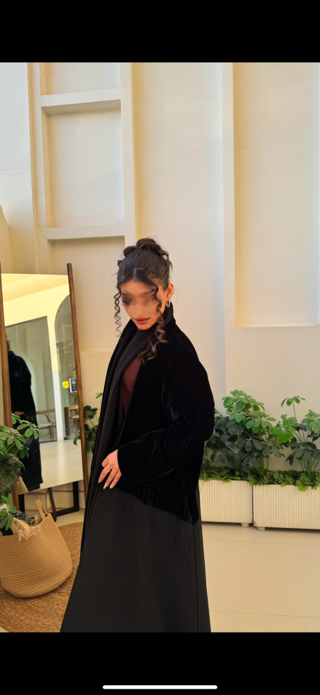 عبايه ايلانقماش العبايه مخمل اسود مع قماش شمواهكرستال اسود من الامام وسط العبايهقصه العبايه نص كلوشالتفصل 7 ايام