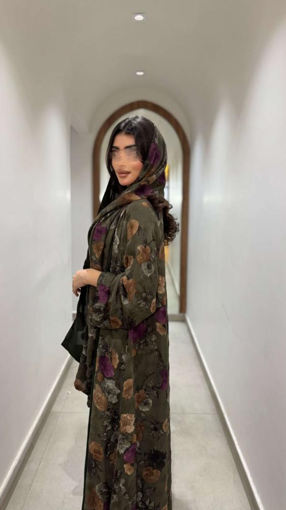 عبايه مشجره ( لون زيتوني )قماش العبايه شيفون مورد بارد صيفيمبطنه بقماش طرحهقصه نص كلوشمدده التفصيل 5 ايام عملالطرحه وجهين ساده ومورده