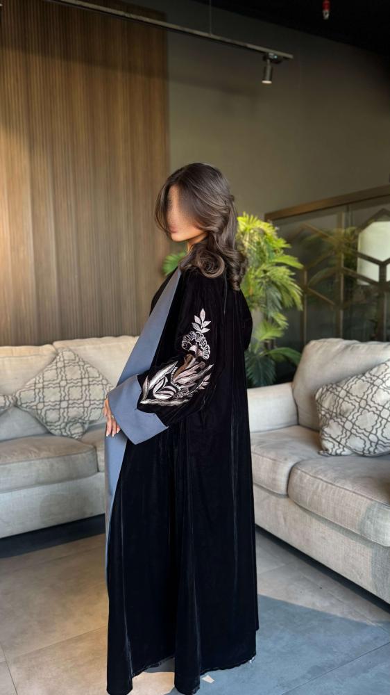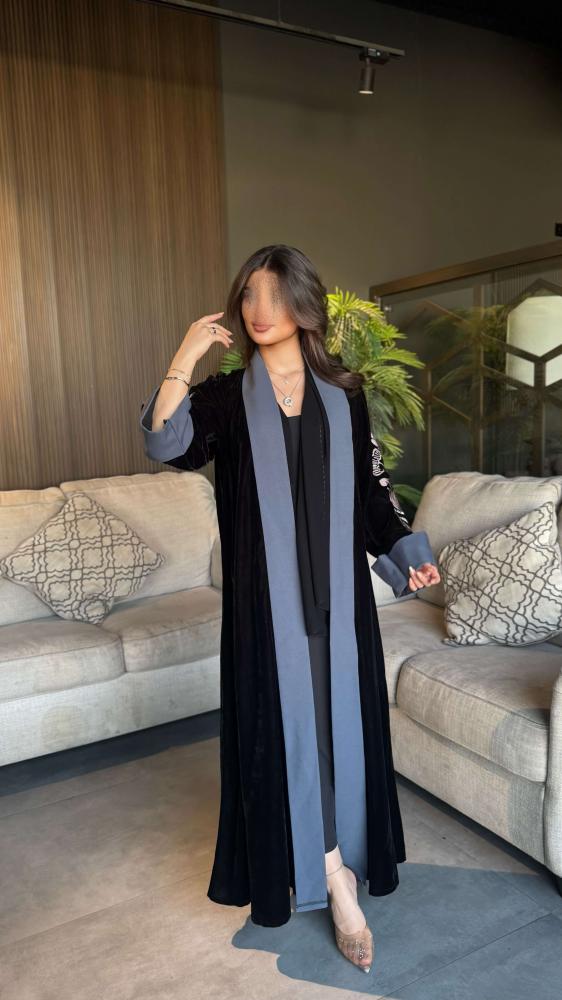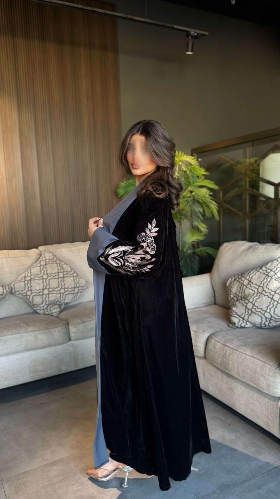 عبايه نورهان القماش / مخمل القماش الرمادي / كتان التطريز اكمام يدوي قصه / نص كلوش التفصيل 5 ايام طرحه مجانا ساده