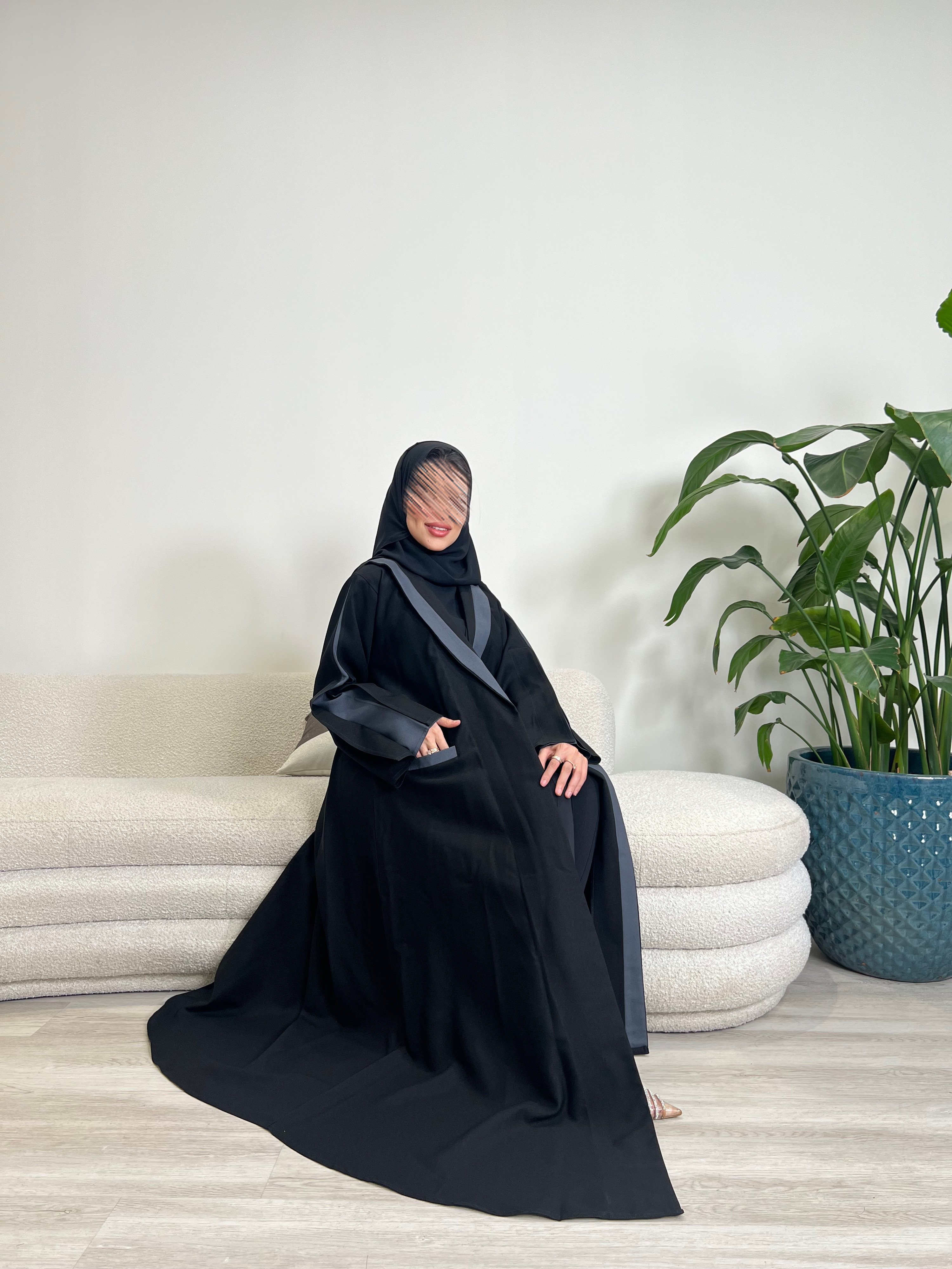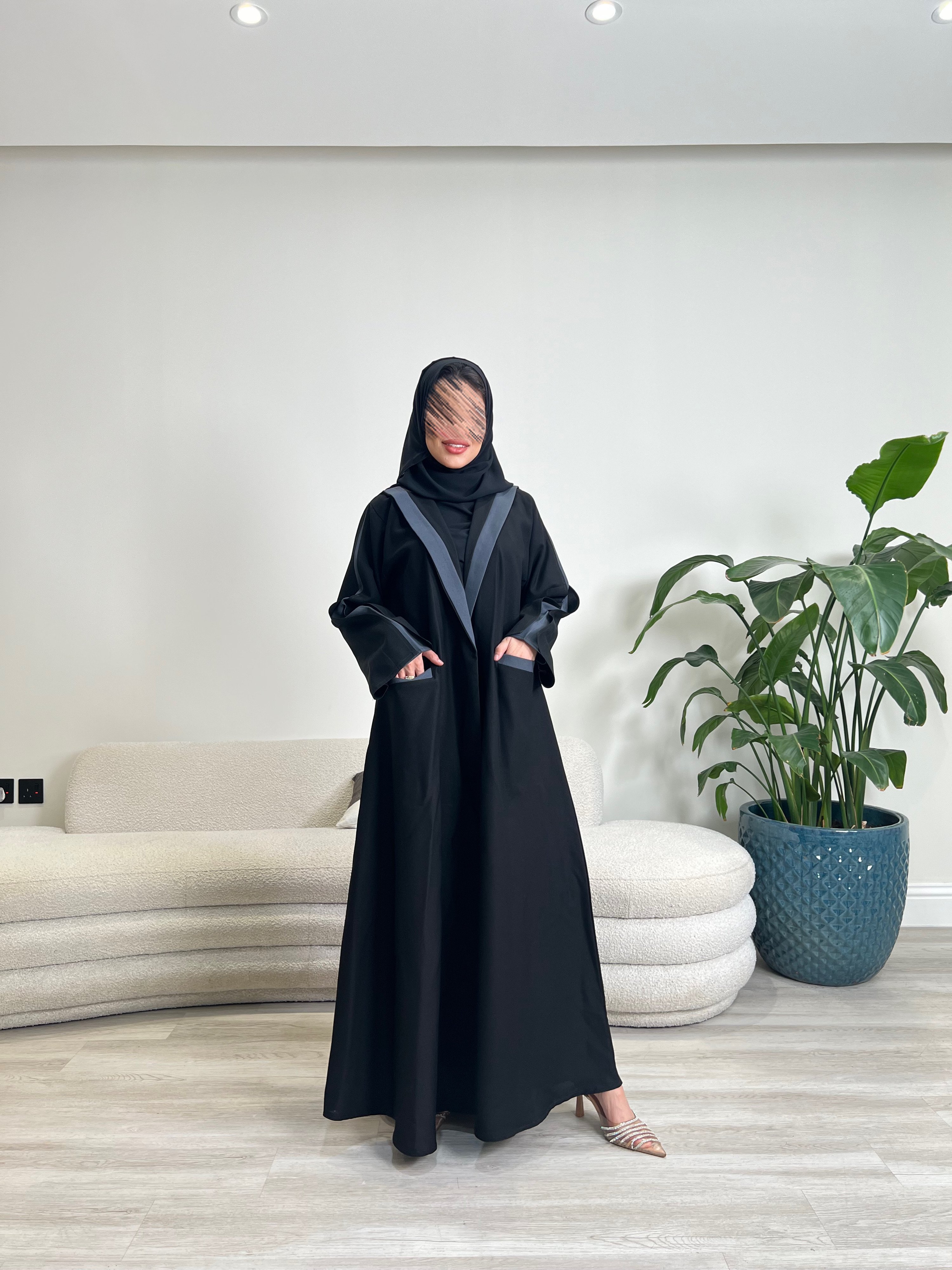 عبايه سديمقصه نص كلوشلون رصاصي مع جيوب اماميهقصه الكم مفتوحه من الامام الصوره موضحه اكثرقماش كتان صيفي واقف شي بسيط عمليالتفصيل 4 ايام عمل